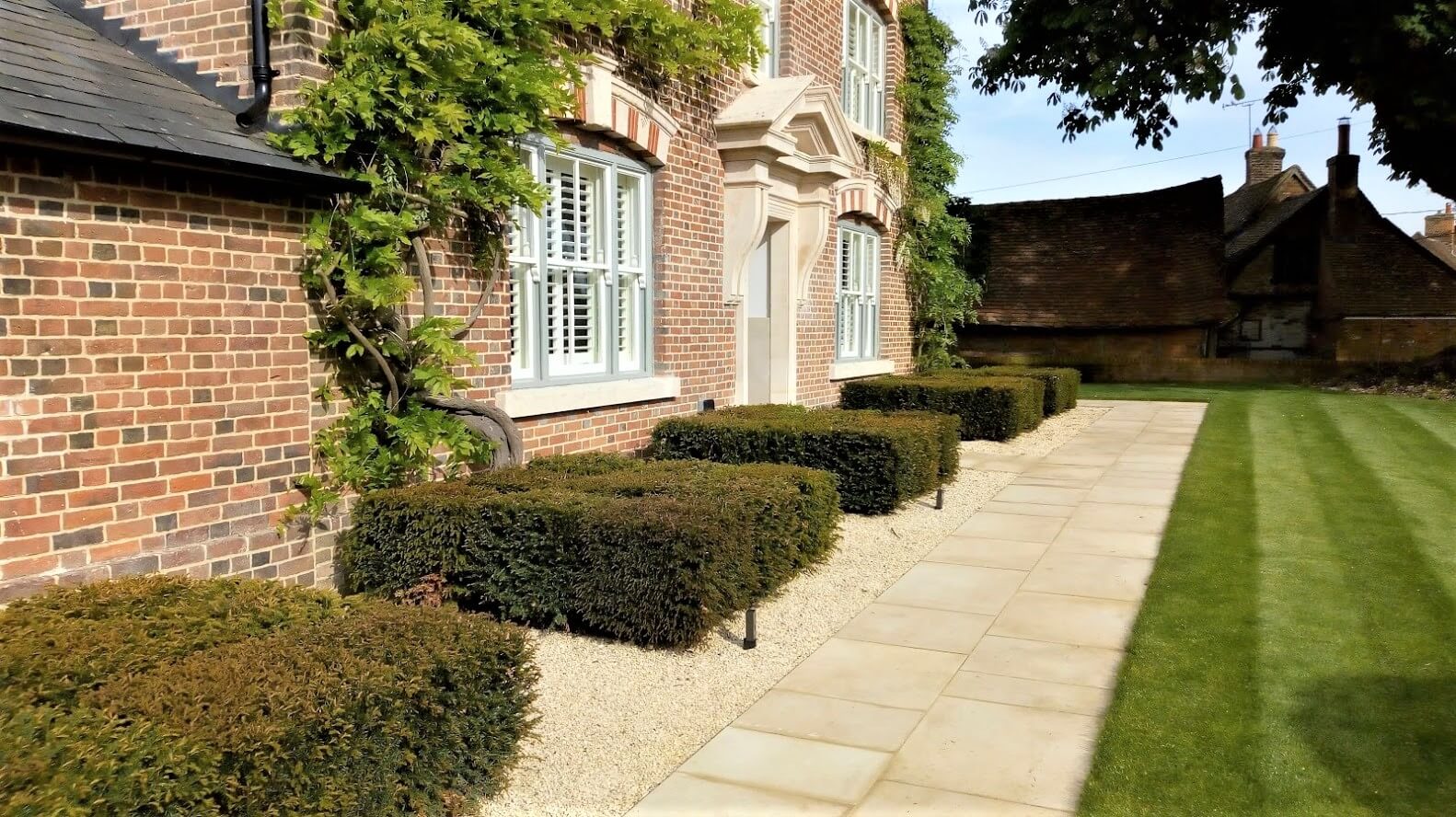 Squares of Yew run along the front of the house, enhancing the geometric nature of the facadeSep 21, 2018